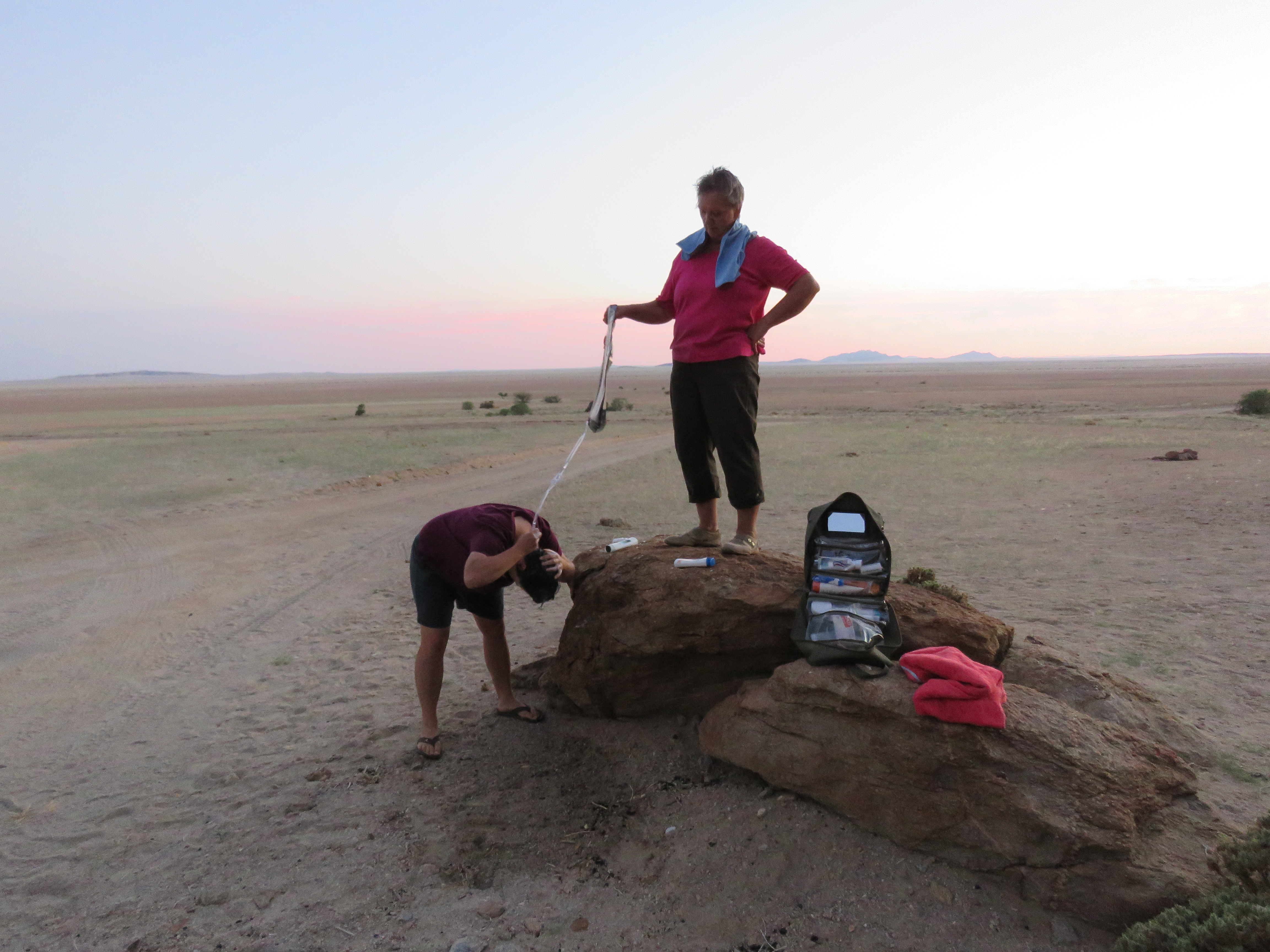 Dit is veral die swartsakke vol stortwater wat op die klippe in die son warm gemaak word om ‘n buitelugstort te vat wat vir ons groot genot verskaf.