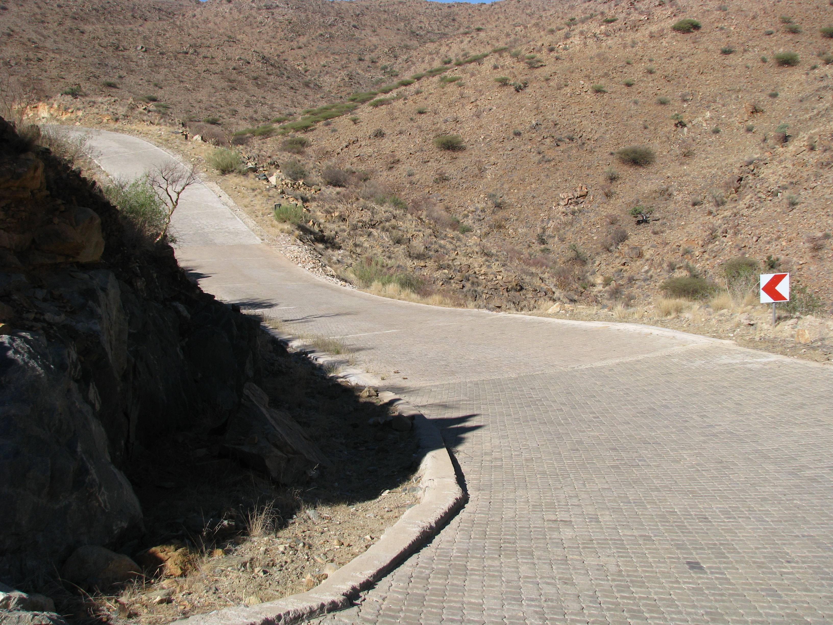 Die Spreetshoogtepas na Solitaire begin hier. Dis die stylste pas in Namibië en daar mag nie sleepwaens getrek word nie. Die draaie is baie skerp en daar is min ruimte langs die pad.