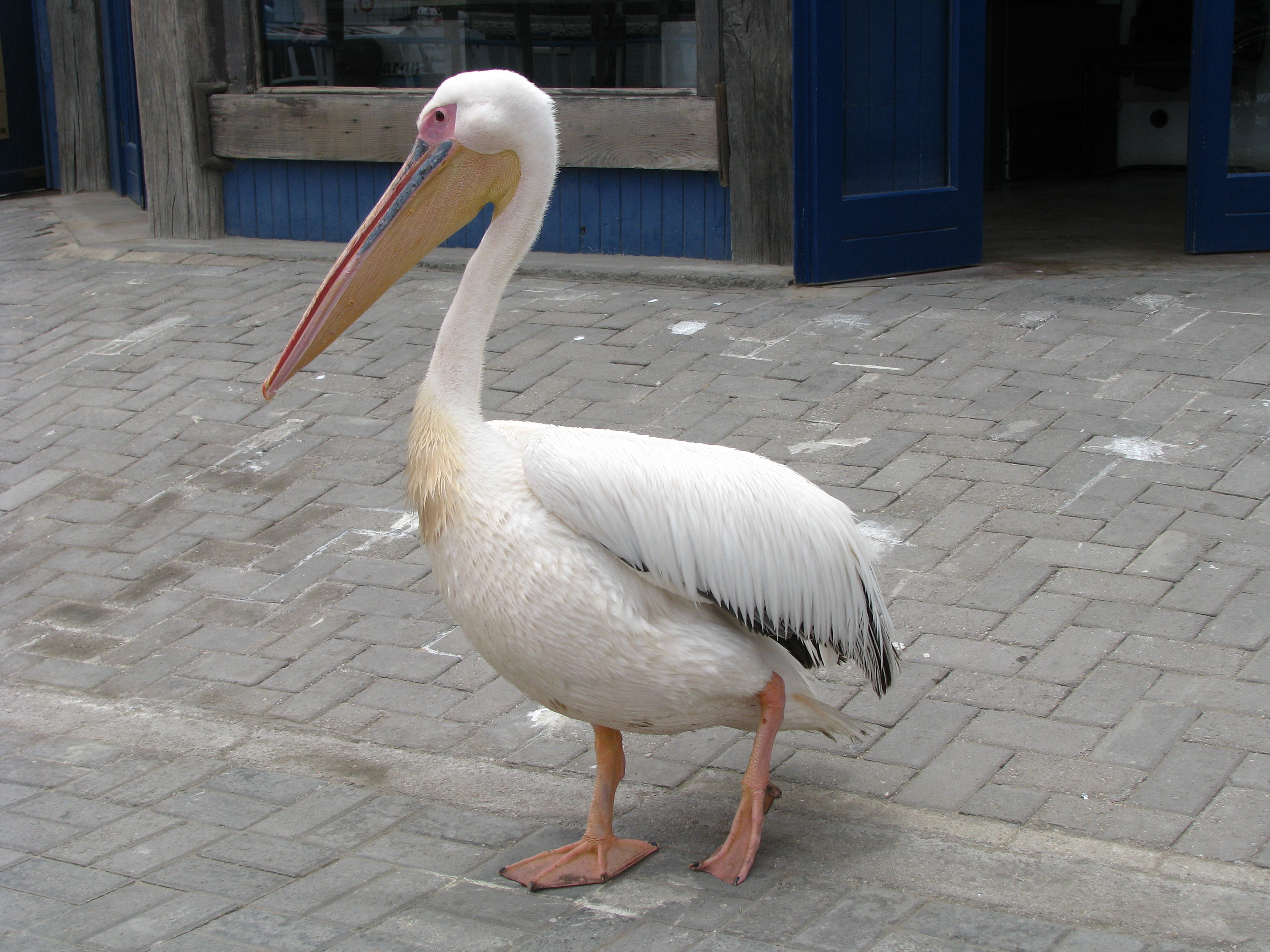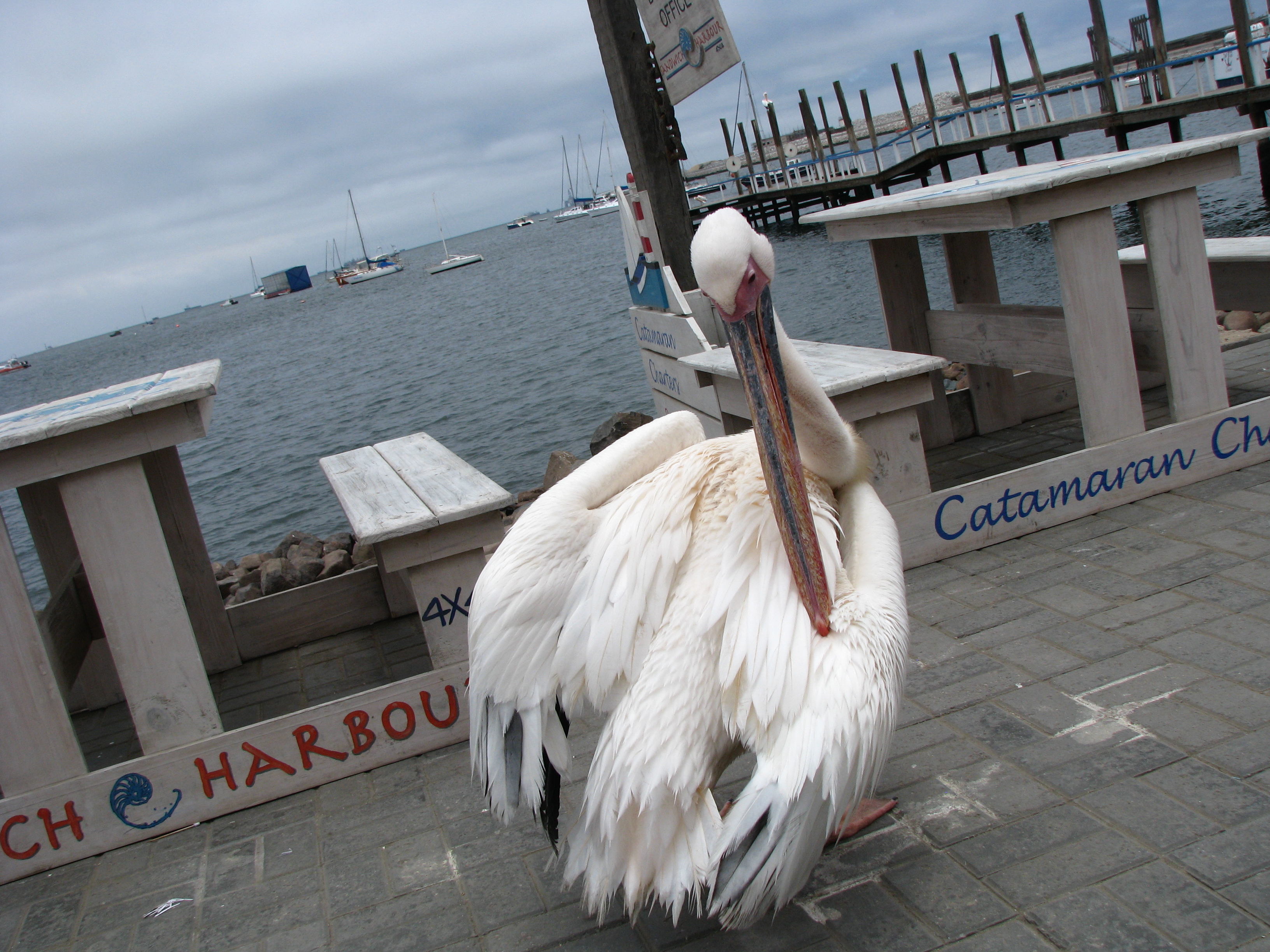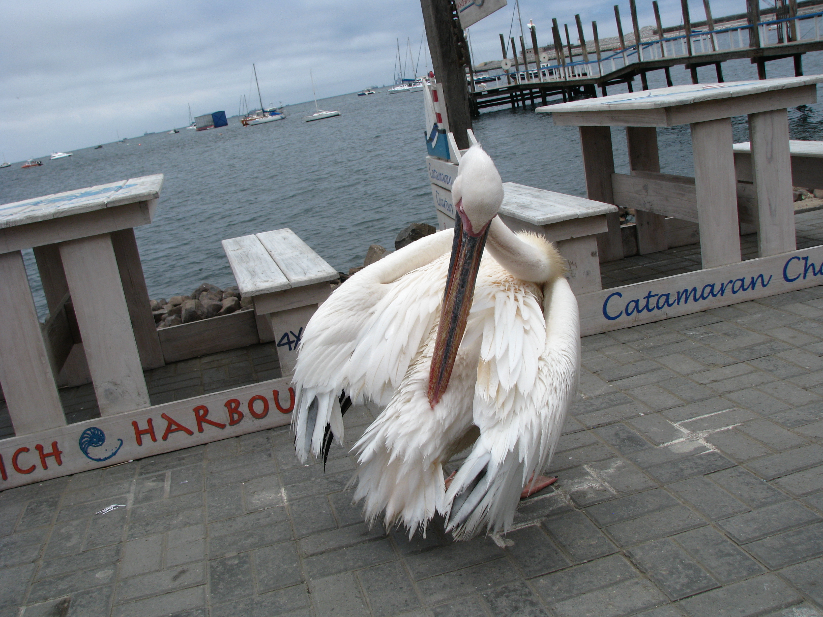 By die waterfront het die ou pelikaan ons vermaak, sommer so tussen die mense.
