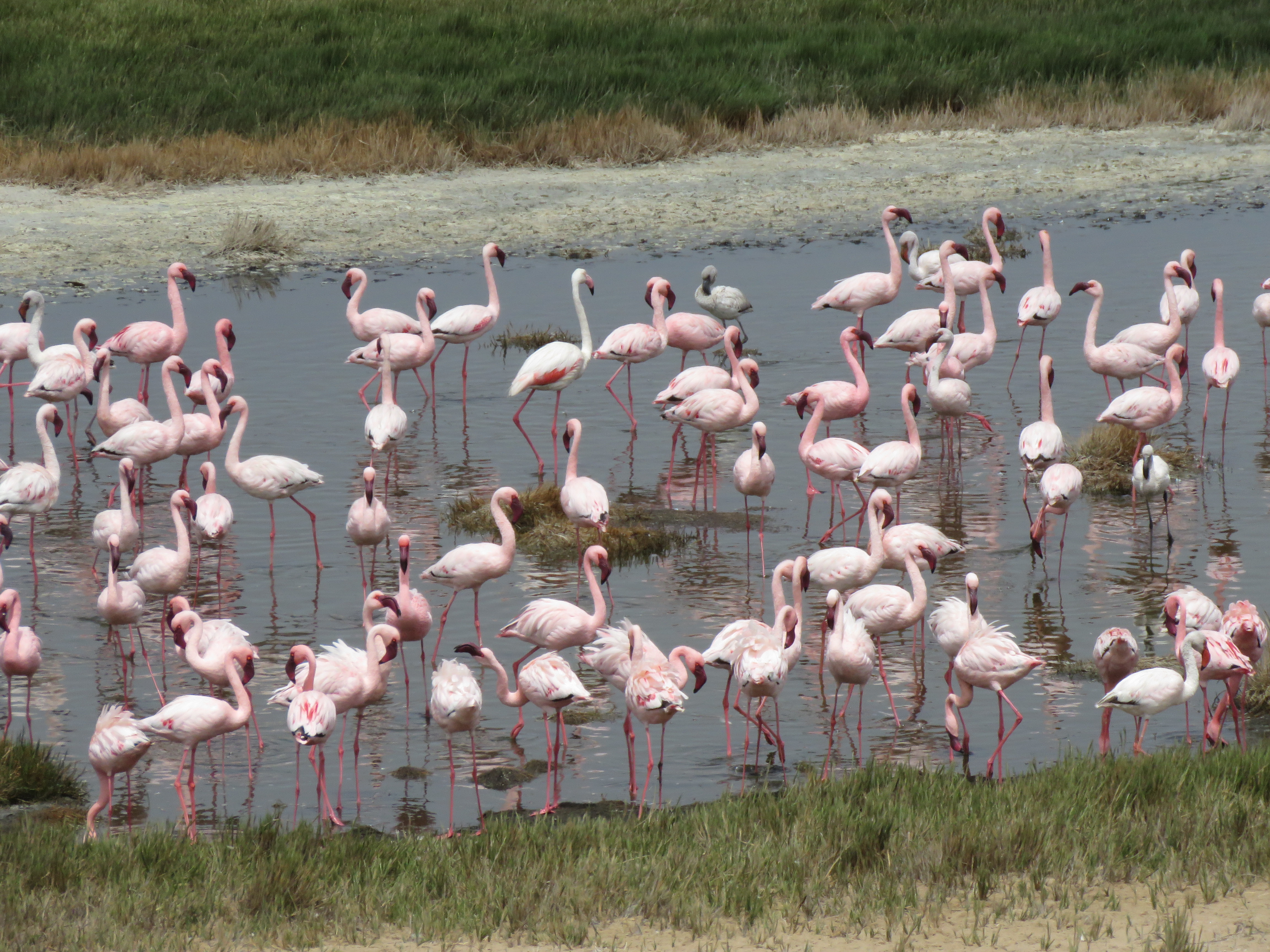 Om by die unieke plek uit te kom moet jy verby die lagoon en die Soutpanne met sy ryk voëllewe ry. Dit vorm deel van die belangrikse vleilande van Suidelike Afrika. Die pienk kleur van die Soutpanne met die pienk flaminke vang jou oog vas. Reusagtige duine loop hier teen die see dood of vorm diep kolkgate na die woestyn se kant toe.