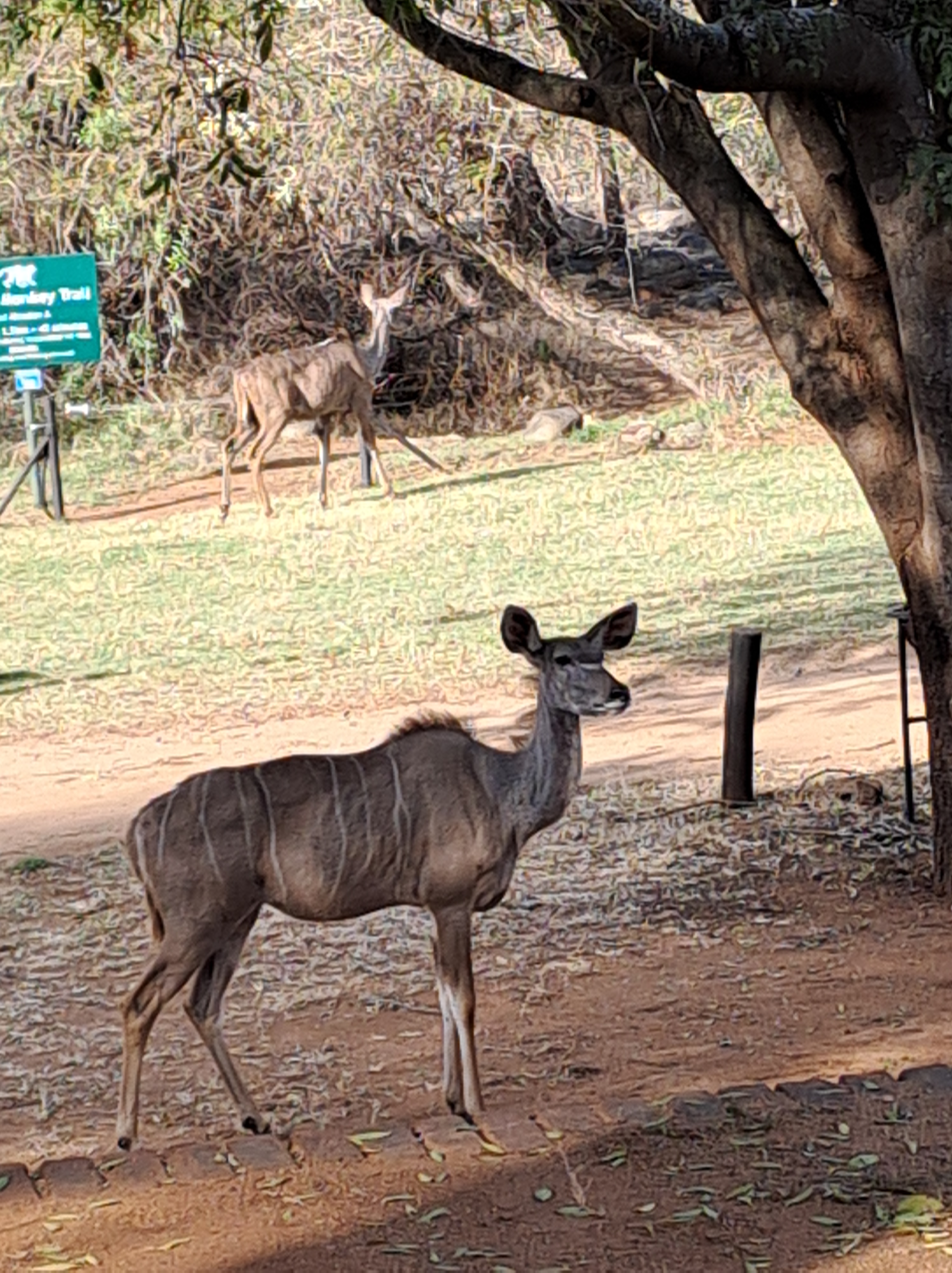 Die koedoes wei rustig deur die kamp. As jy ‘n wortel of ‘n groenblaar vir hulle hou kom eet hulle dit uit jou hand.
