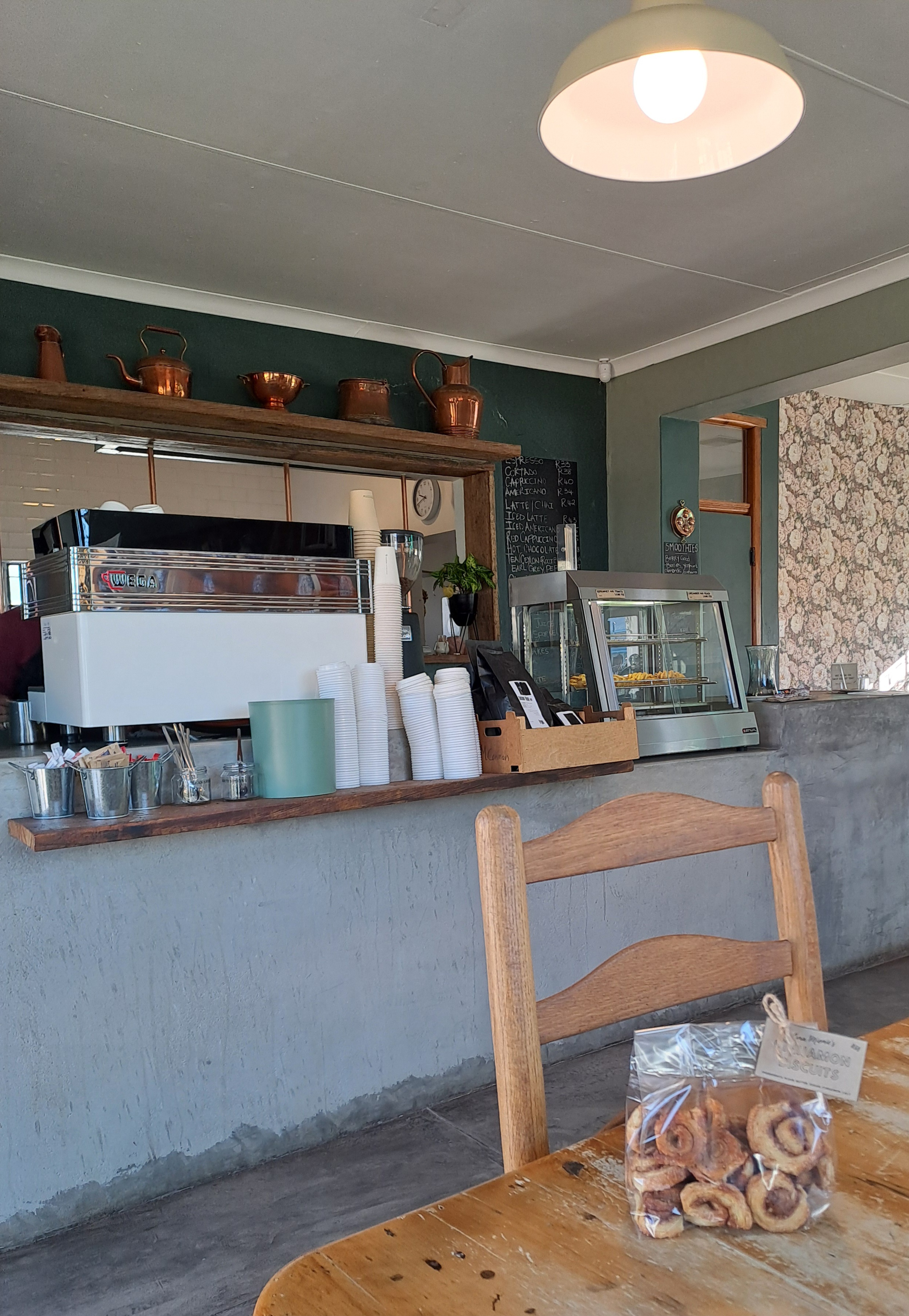 Heerlike gebak, ingelegte en gedroogte vrugte, nuwe en gebruikte boeke en nog vele meer maak die rakke vol. Ons het nog nie daar geeet nie, maar die restaurant lyk vol belofte. Die badkamers is rolstoel vriendelik.