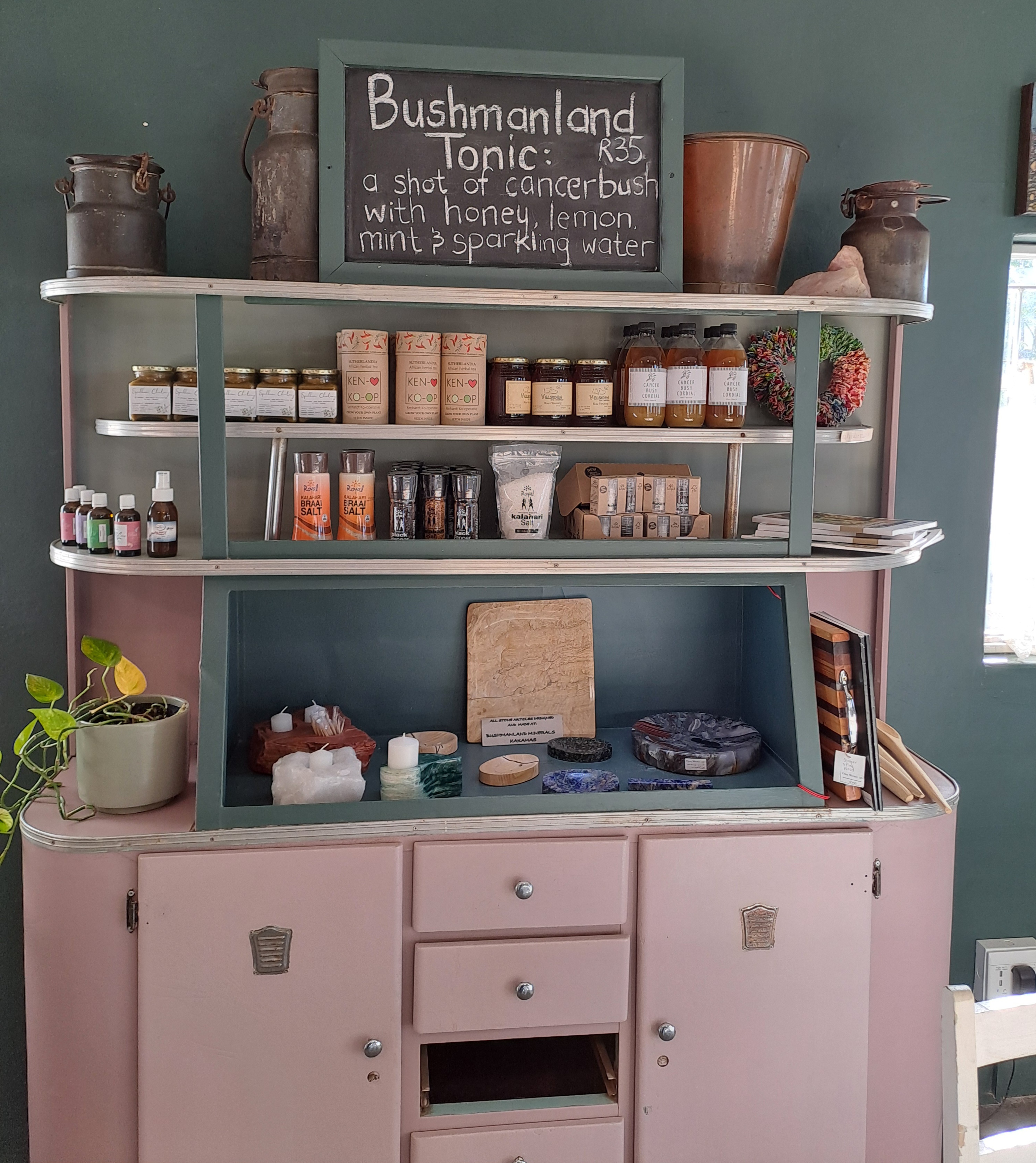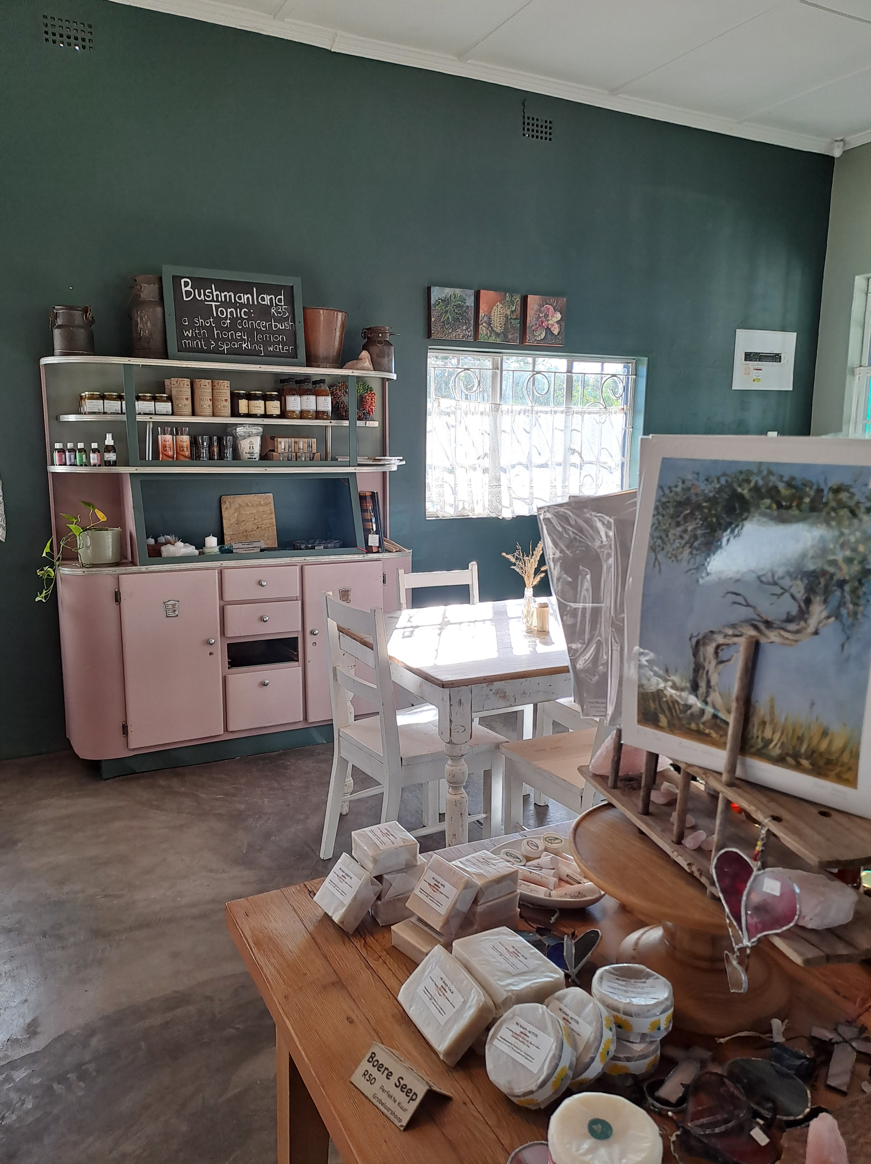 Op hulle rakke is lekker koekies, beskuit en gedroogte vrugte, gemmerbier, konfyt en ingelegte vrugte, teveel om van te kies. Daar is ook mooi naaldwerk, enemelbekers en bakkies. Koop sommer hier iets om saam huis toe te vat.