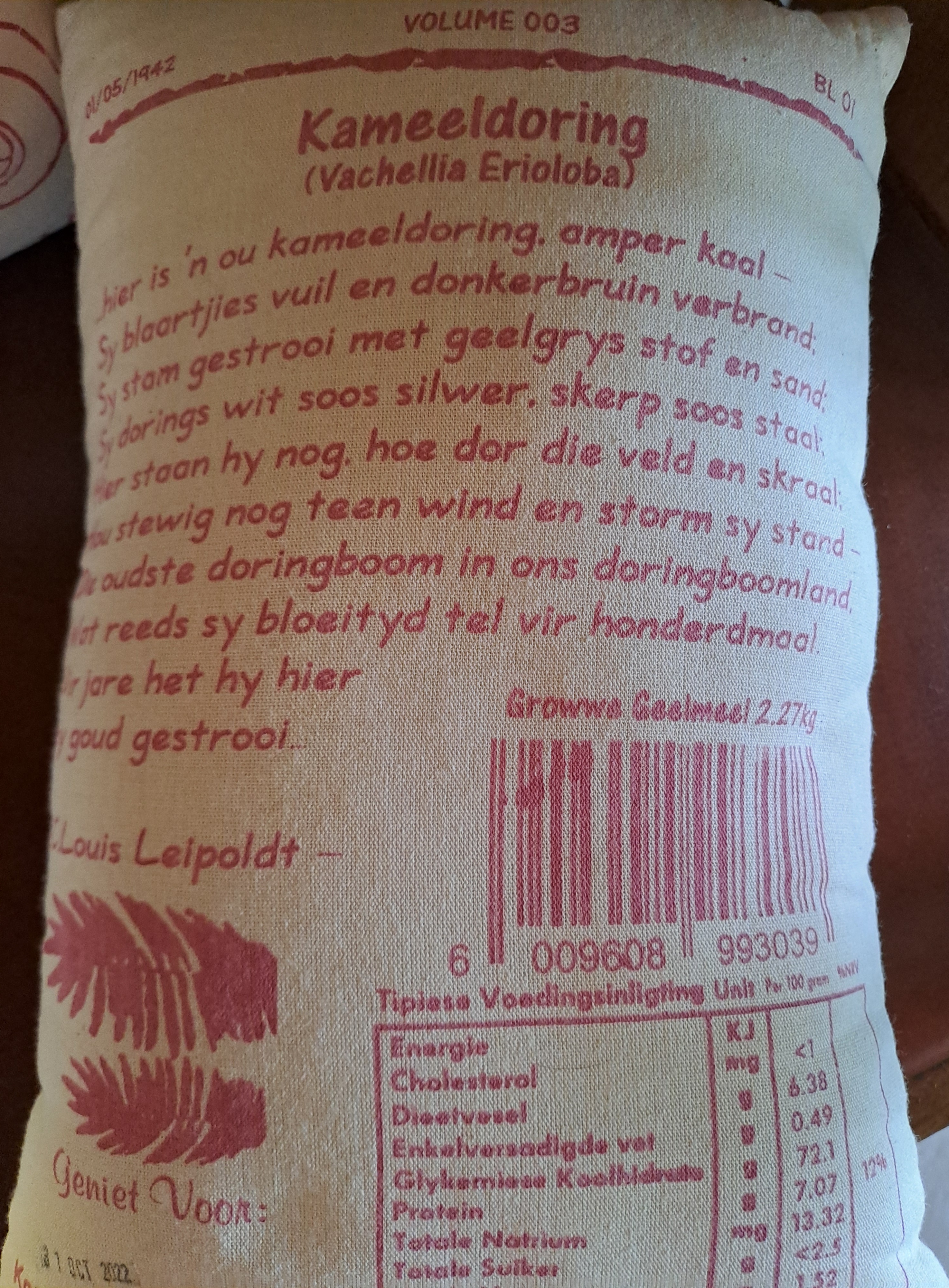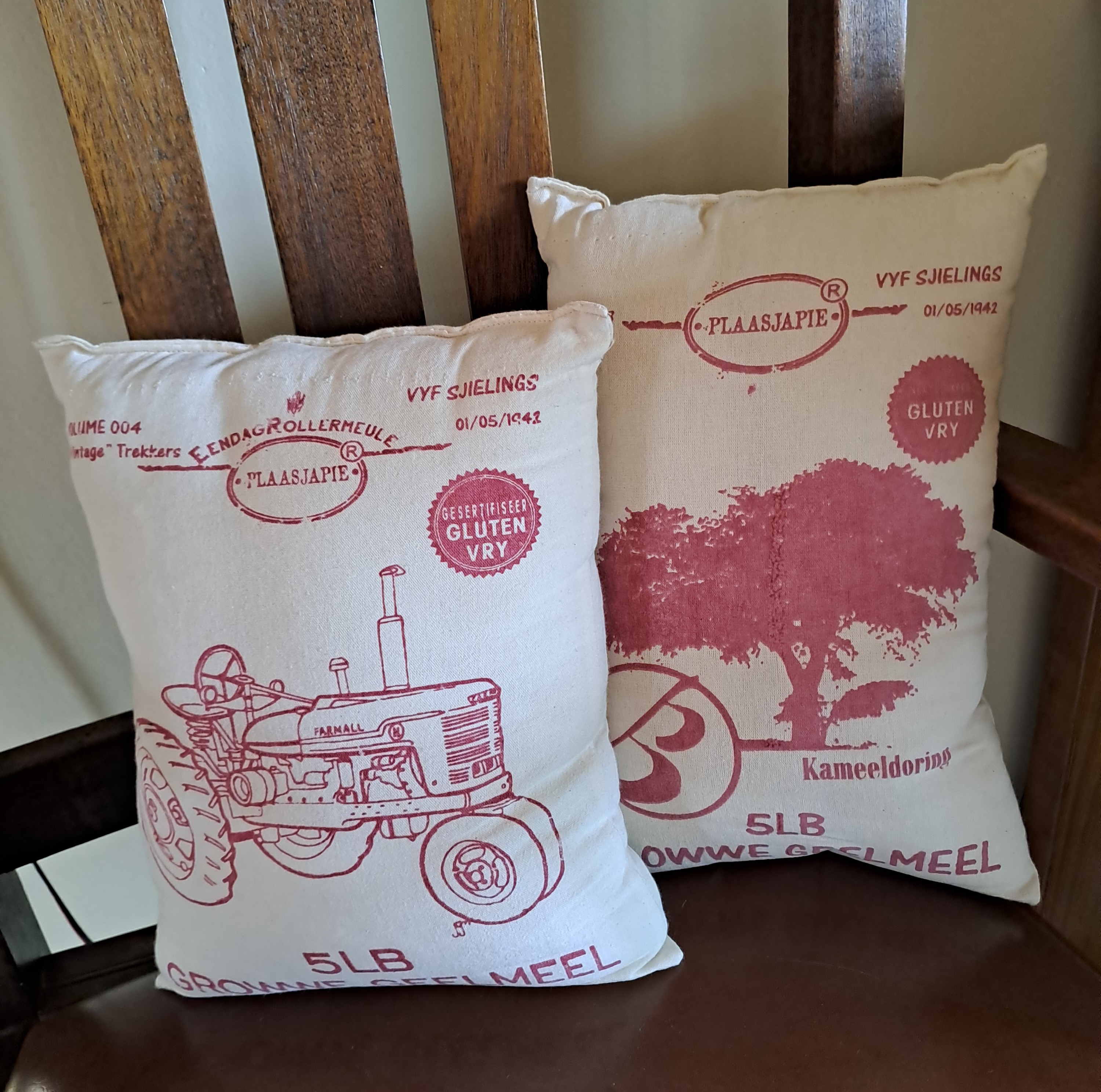 Lekker vars growwe mieliemeel is in pragtige materiaalsakkies te koop. Ek stop hulle met watteersel en werk hulle toe vir stoelkussinkies.