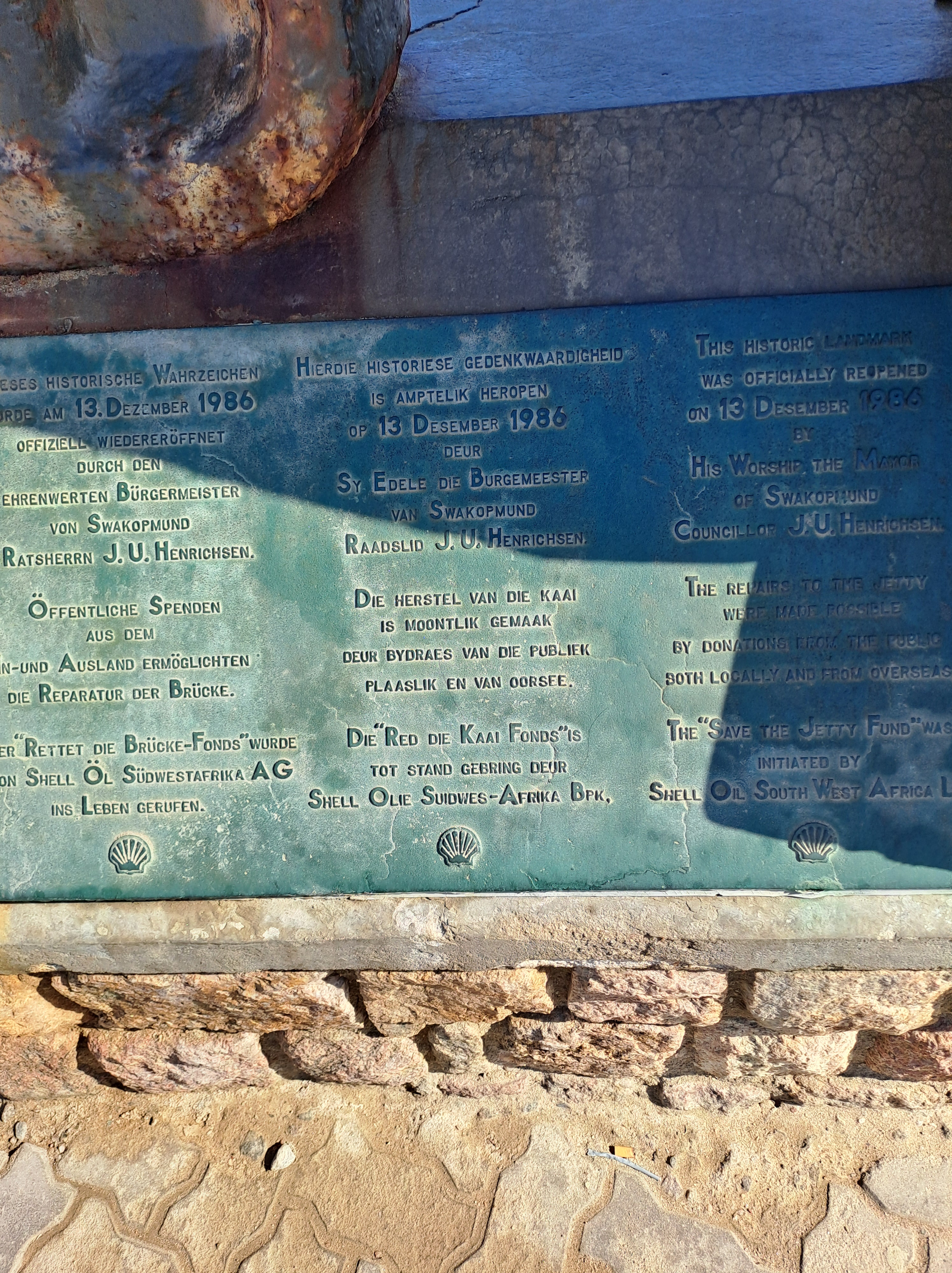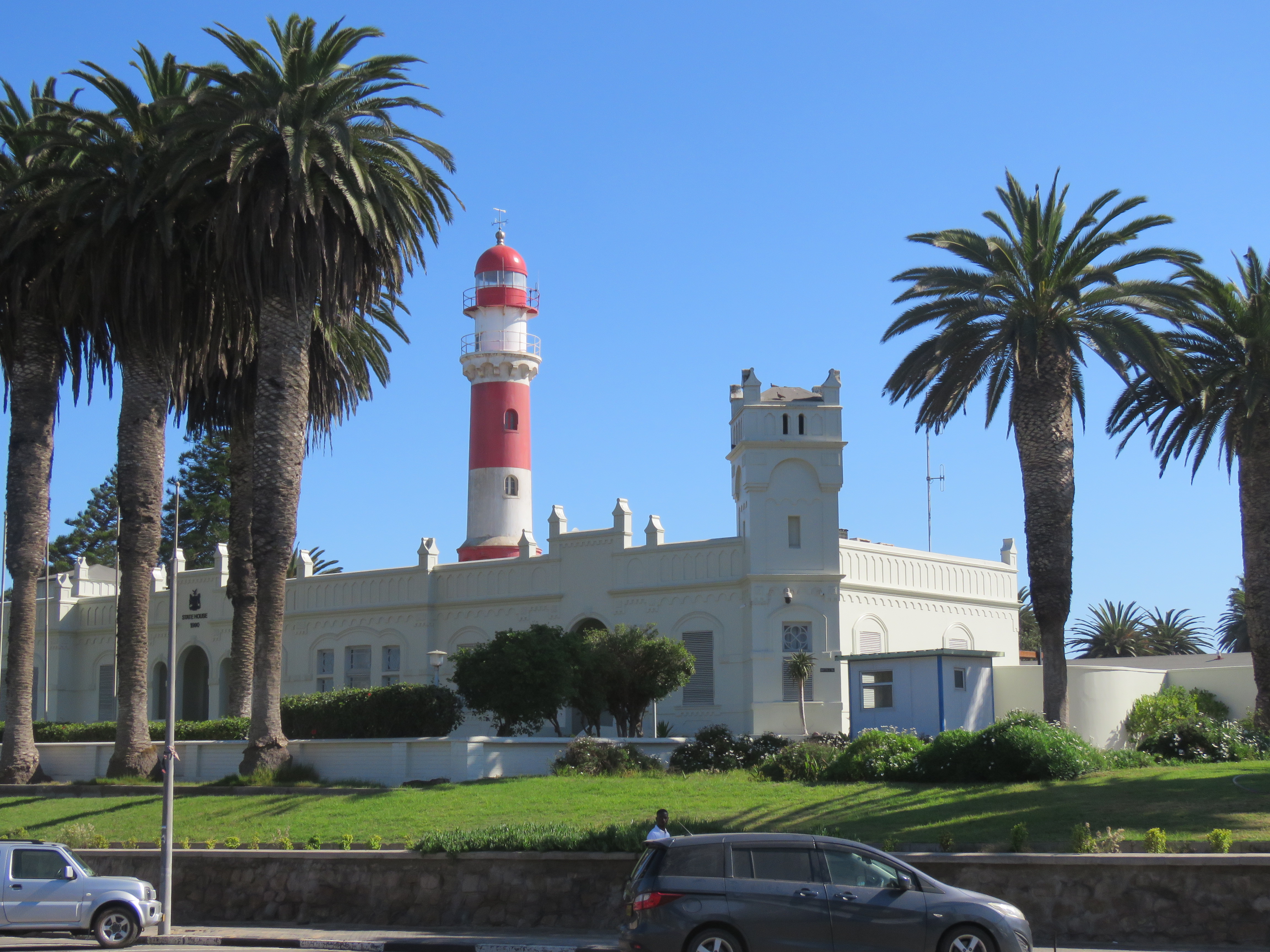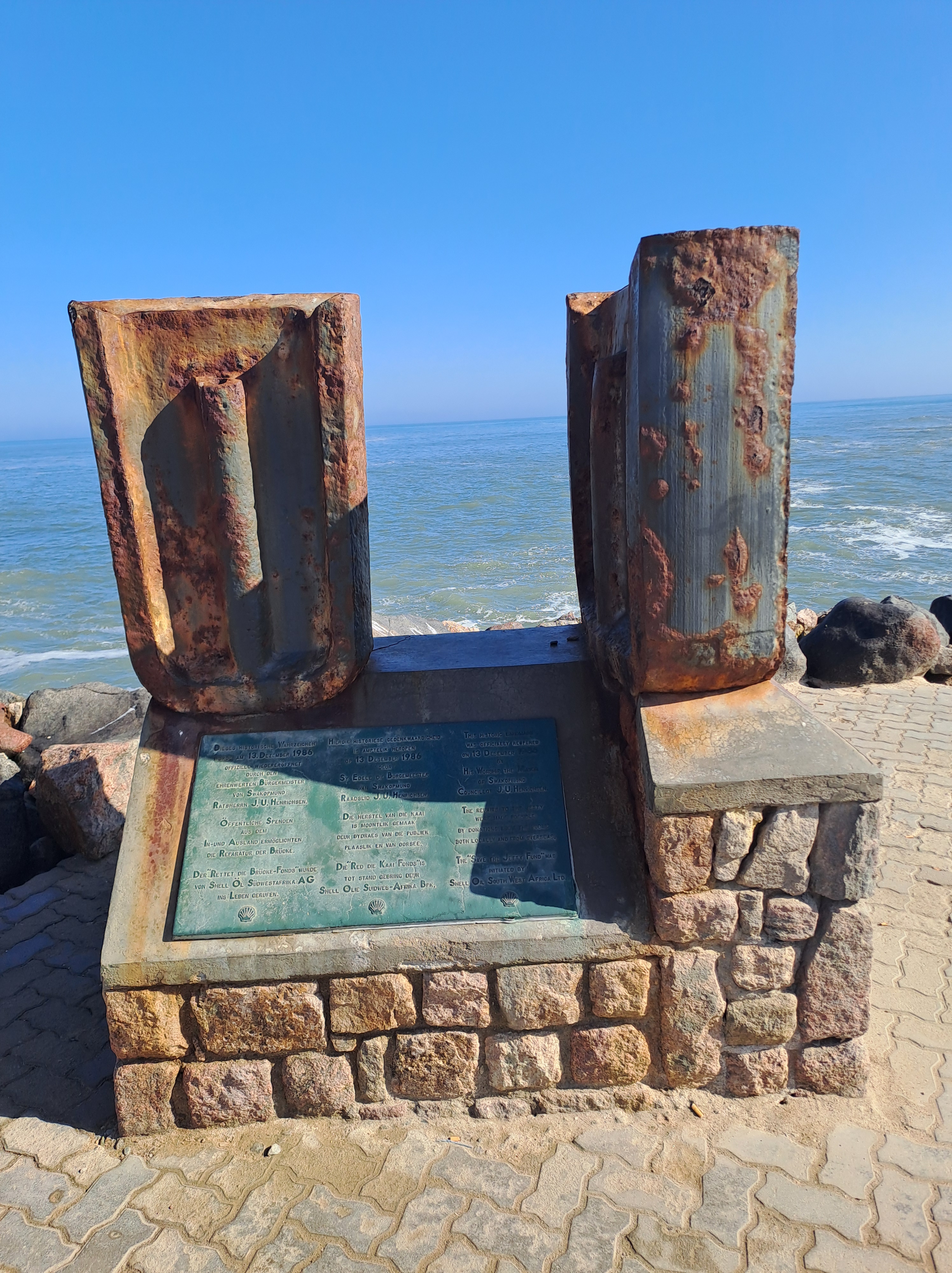 Loop verder aan met die palmlaning tot by die mole. Die hawe muur (die mole) is in 1899 in ‘n poging om ‘n hawe te maak, gebou. Baie gou het die see strome sand daar gedeponeer en was dit te vlak vir bote om te anker. Nou is dit Swakop se swem strand. Ons het reeds in die begin 60’s die heerlikste roomys by die strandkafee’s gekoop. Nou is hier ‘n pragtige hotel met heerlike ontbyte en etes. Die museum, ligtoring en die amfiteater is hier. Die monument is die Marine Denkmal – opgerig vir die eerste Mariene ekspidisiekorps wat tydens die Herero-oorlog in 1904-1905 gesneuwel het. Die figuur stel ‘n marinier voor wat by sy gewonde makker staan. Dit is in 1908 in Berlyn gegiet en deur die bemanning van die Duitse kannonnierboot, Panther aan die dorp geskenk.