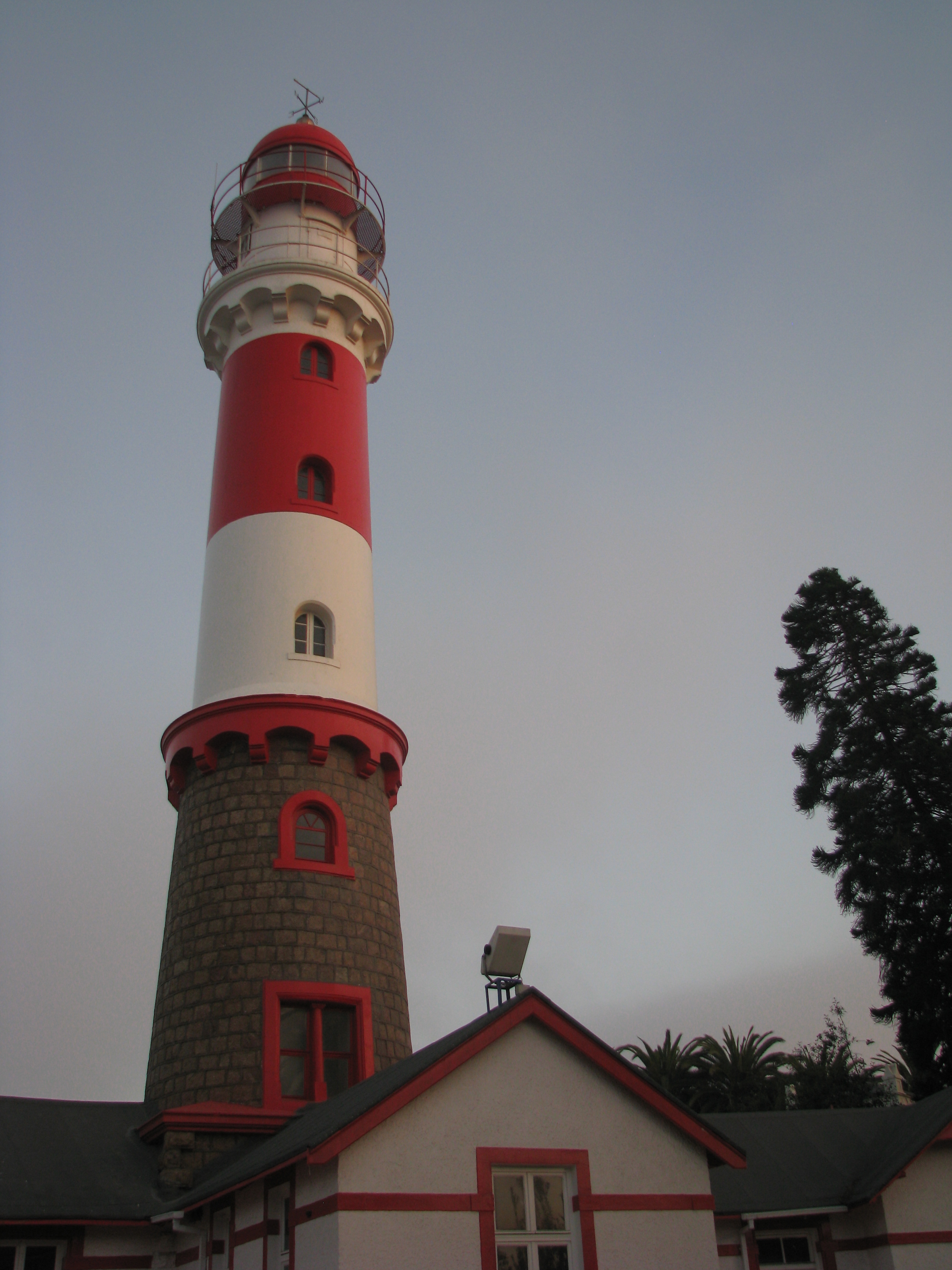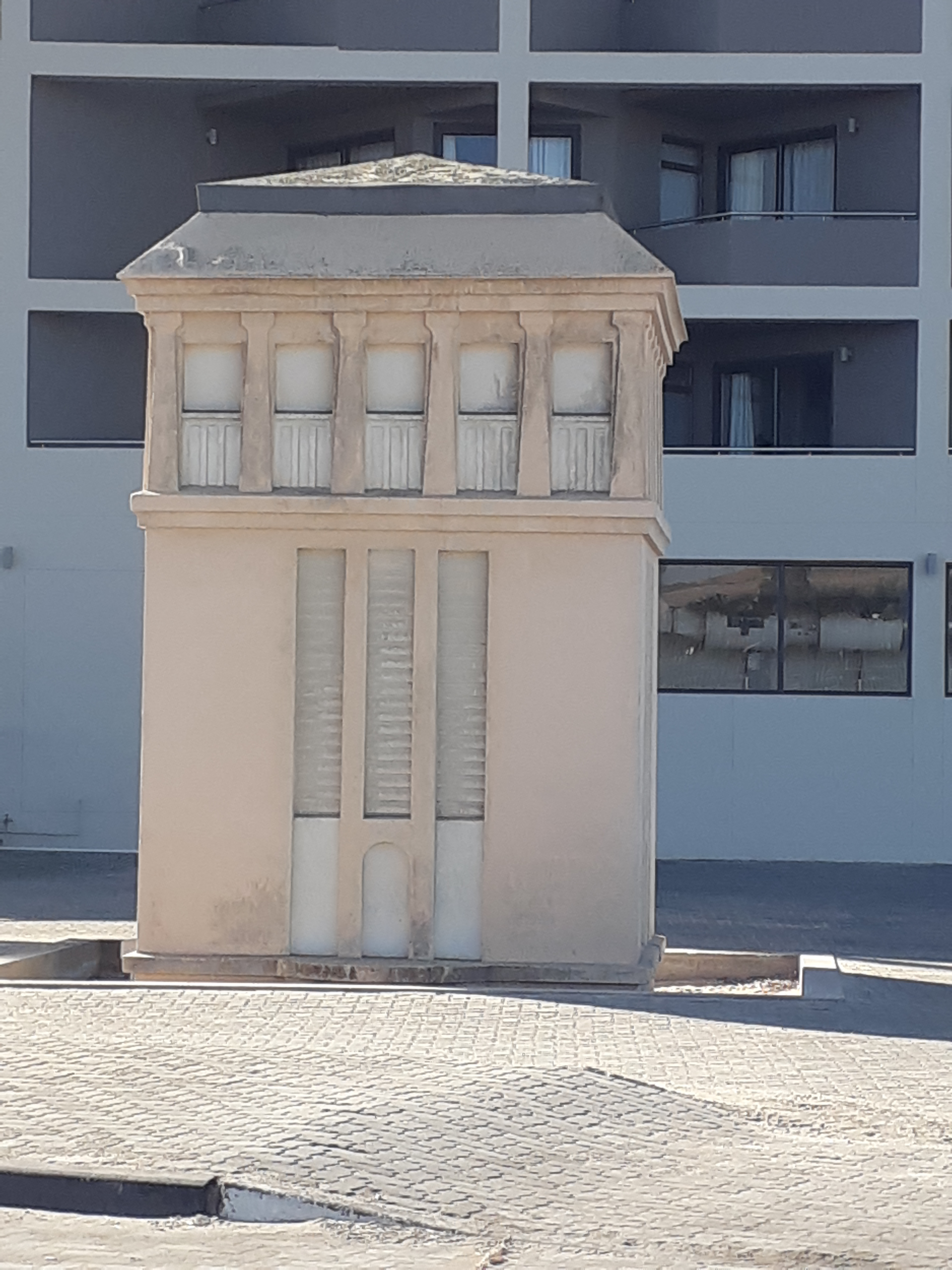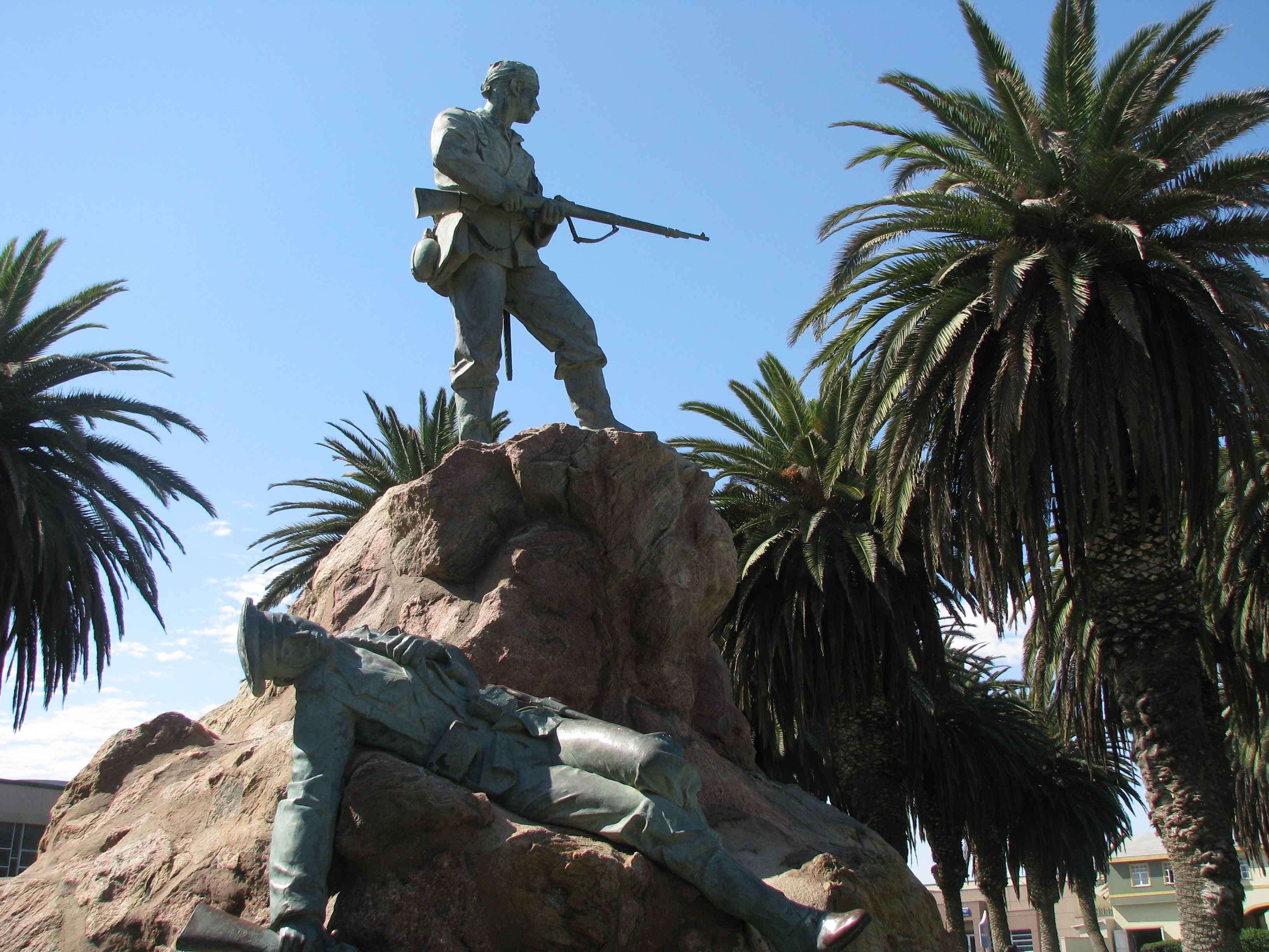 Loop verder aan met die palmlaning tot by die mole. Die hawe muur (die mole) is in 1899 in ‘n poging om ‘n hawe te maak, gebou. Baie gou het die see strome sand daar gedeponeer en was dit te vlak vir bote om te anker. Nou is dit Swakop se swem strand. Ons het reeds in die begin 60’s die heerlikste roomys by die strandkafee’s gekoop. Nou is hier ‘n pragtige hotel met heerlike ontbyte en etes. Die museum, ligtoring en die amfiteater is hier. Die monument is die Marine Denkmal – opgerig vir die eerste Mariene ekspidisiekorps wat tydens die Herero-oorlog in 1904-1905 gesneuwel het. Die figuur stel ‘n marinier voor wat by sy gewonde makker staan. Dit is in 1908 in Berlyn gegiet en deur die bemanning van die Duitse kannonnierboot, Panther aan die dorp geskenk.