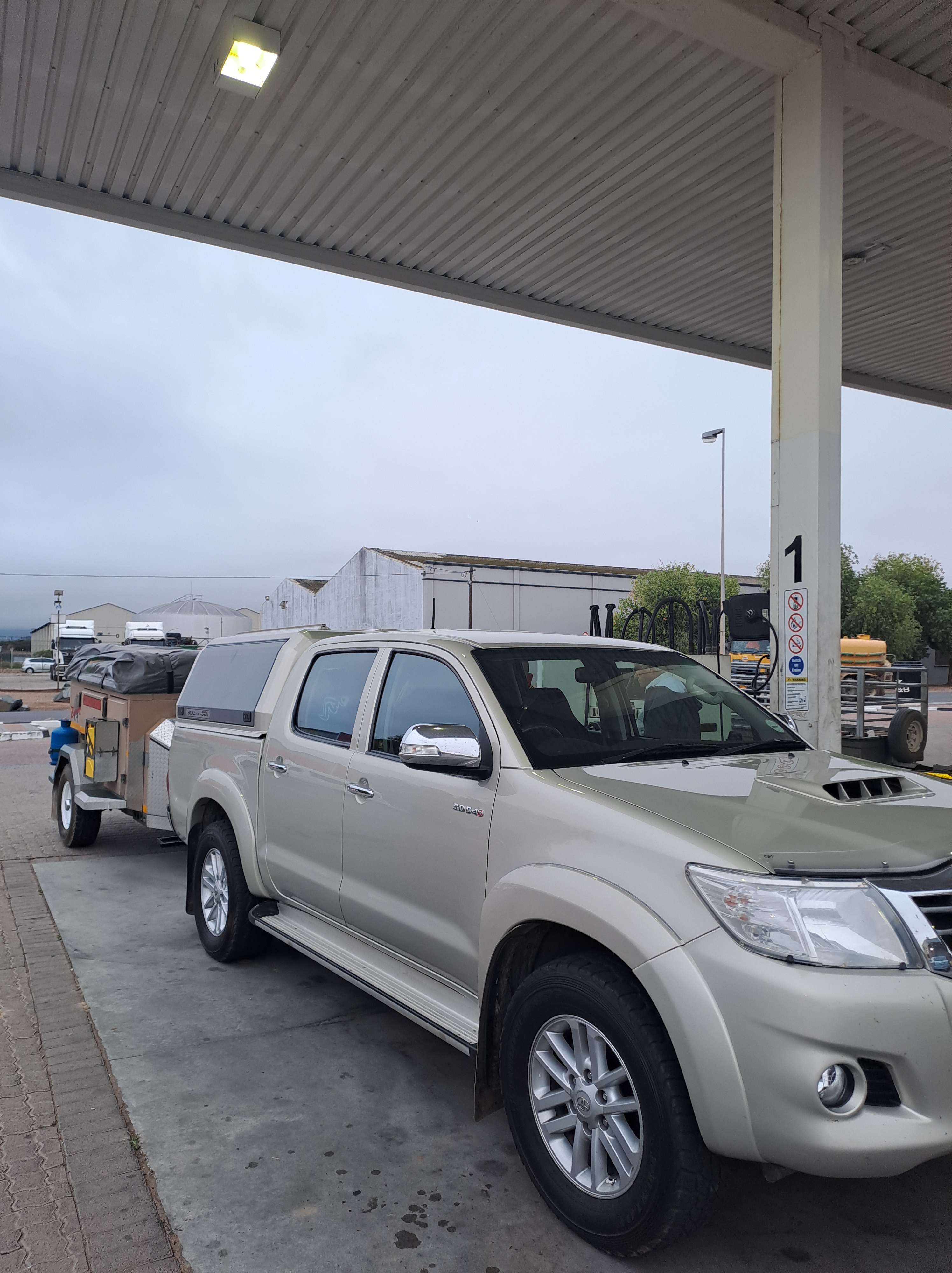 By Maltahohe hou die teerpad op. Nou moet ons plan om die klippe van ons agter ruit af weg te hou, in werking gestel word. Ons sit ons klippeskerm tussen die bakkie en die wa op. (Ons het al 2 keer ‘n agterruit verloor omdat ‘n klip vanaf die wa teen die agterruit vasgeslaan het. Ons vat nie meer ‘n kans nie. My man het die plan gemaak. Dis maklik, vinnig en uiters effektief.