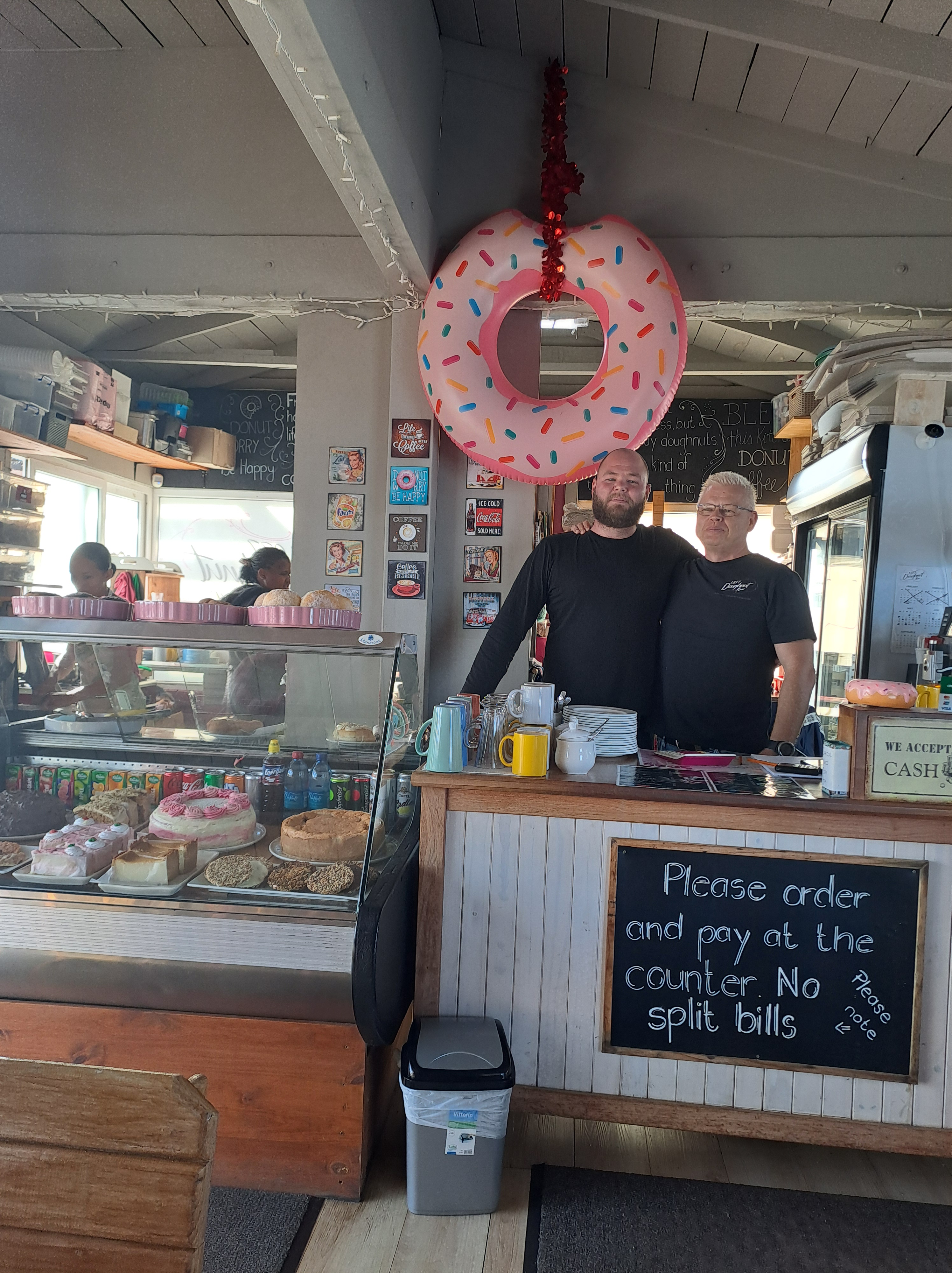 Verwyl ‘n oomblik in die koffie- en donutwinkeltjie in die begin van die Jetty. Pa en seun met regte Namibiese gasvryheid skep atmosfeer wat mens nog lank laat terug verlang.