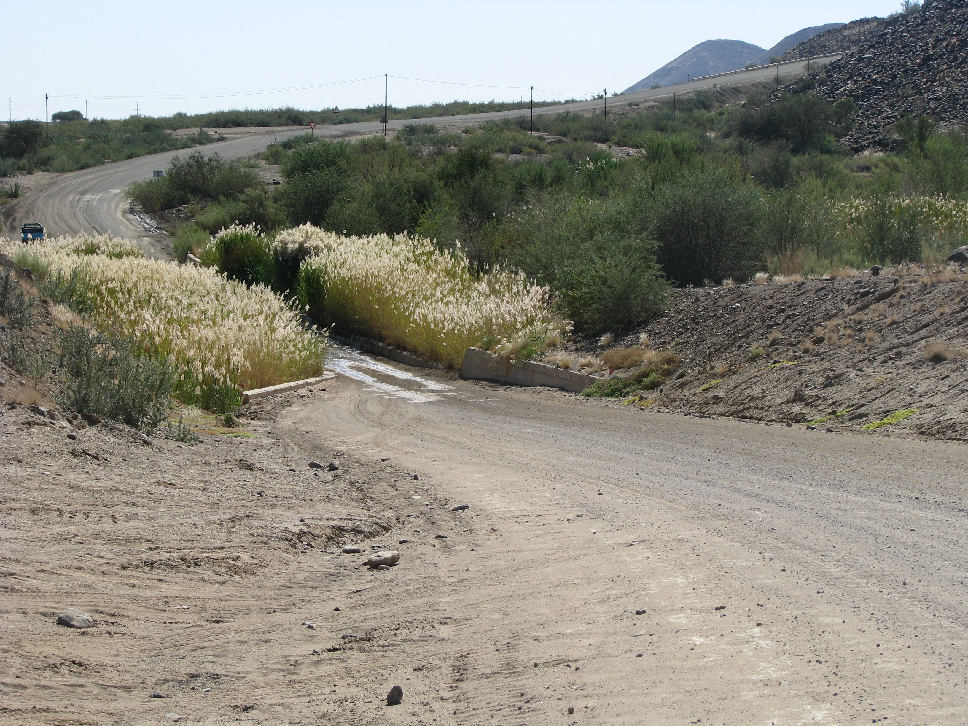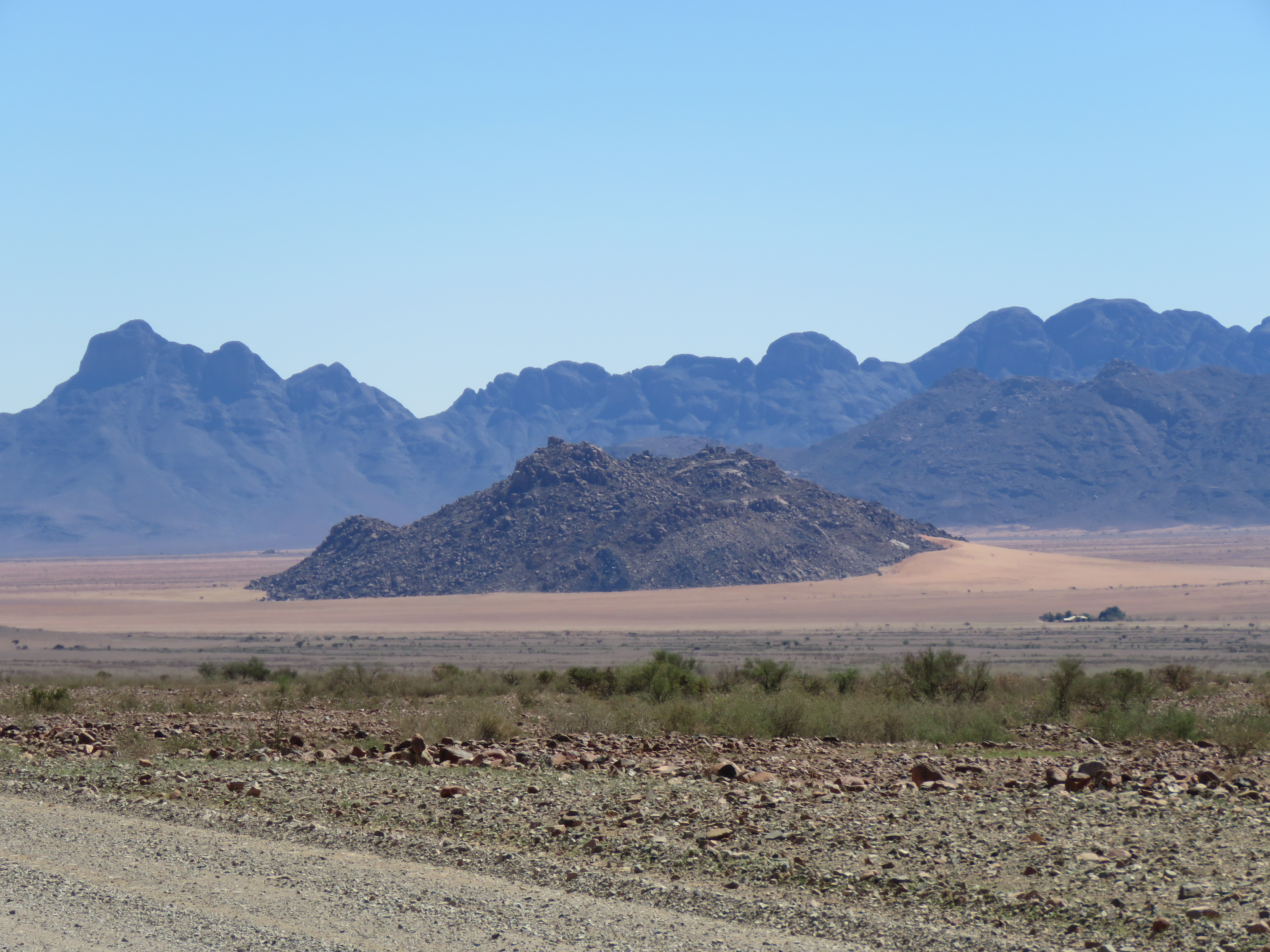 - Grasplatz: 24 km voor Luderitz. Van hieraf kan daar sandduine oor die pad gewaai wees. Vir my voel dit of mens onder die see begin inry. Sand met swart rotse wat uitsteek.